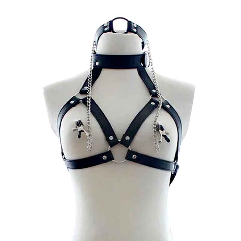 Черная портупея на грудь с кляпом и зажимами для сосков. В комплекте: портупея, кляп с зажимами на соски.