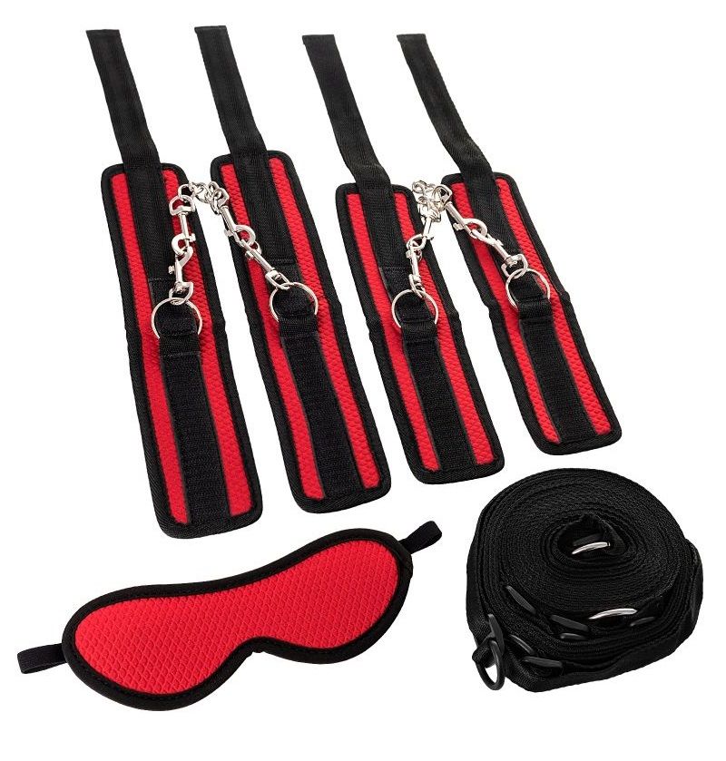 Наручники, оковы и маска - классический набор предметов для игры в подчинение, обязательный для начинающих и опытных поклонников БДСМ. Красно-черный бондажный набор для горячих страстей в вашей спальне! Аксессуары, входящие в него, можно использовать вместе и отдельно. Какому ограничению подвергнуть сабмиссива сегодня? Зафиксировать руки, ноги, закрыть ему свет, или полностью обездвижить? Маска, наручники, оковы и ремни для фиксации - все это незаменимые аксессуары для остроты ощущений. Ограничение свободы движения руками и ногами и полная темнота обостряют другие чувства до предела. Ремни из набора можно протянуть под матрасом и пристегнуть к ним руки и ноги, в таком положении сабмиссив полностью будет во власти своего Доминанта. Длина ремней регулируется под размер матраса, наручники и оковы имеют застежку велкро, маска крепится на резинке – все это дает возможность надеть предметы на человека любого размера. Длина наручников - 23,5 см., ширина - 6 см. Длина оков - 28 см., ширина - 6 см. Длина маски - 25 см., ширина - 7 см. Общая длина ремней - 470 см. Ширина ремней - 2,5 см.